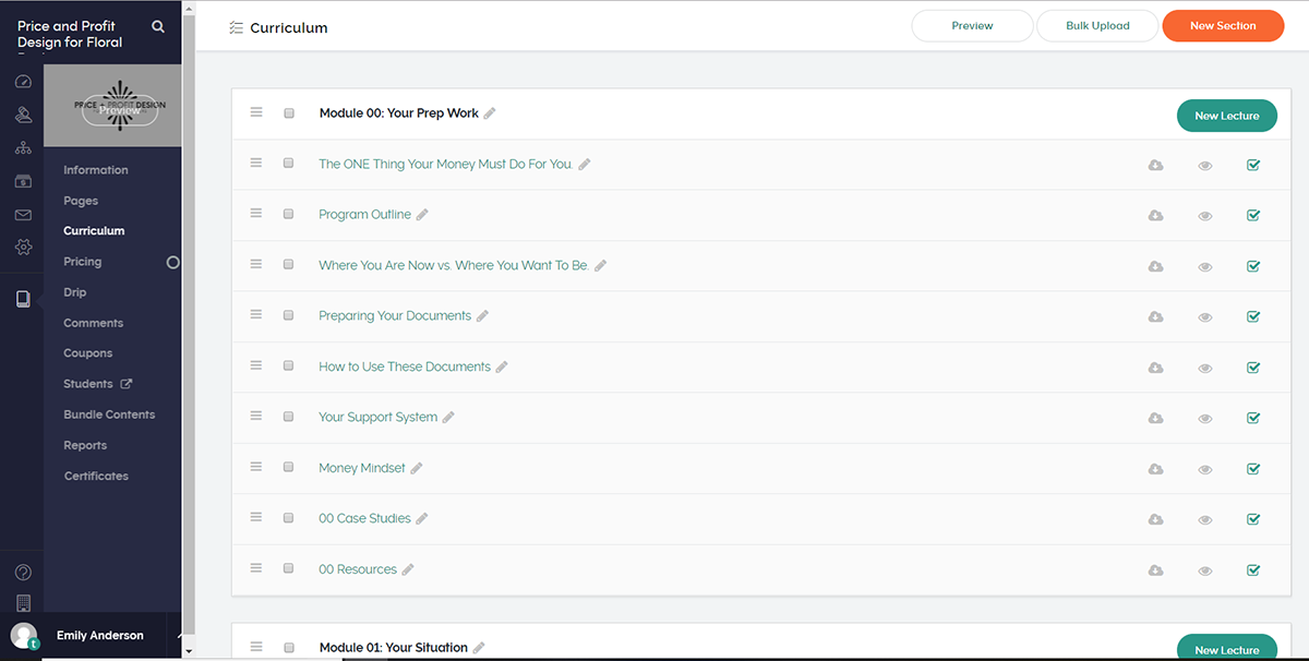 A: The lessons come in video or pdf format with a follow along printable guide and workbook. The tools are a set of spreadsheets in both Excel and Google Sheets formats.