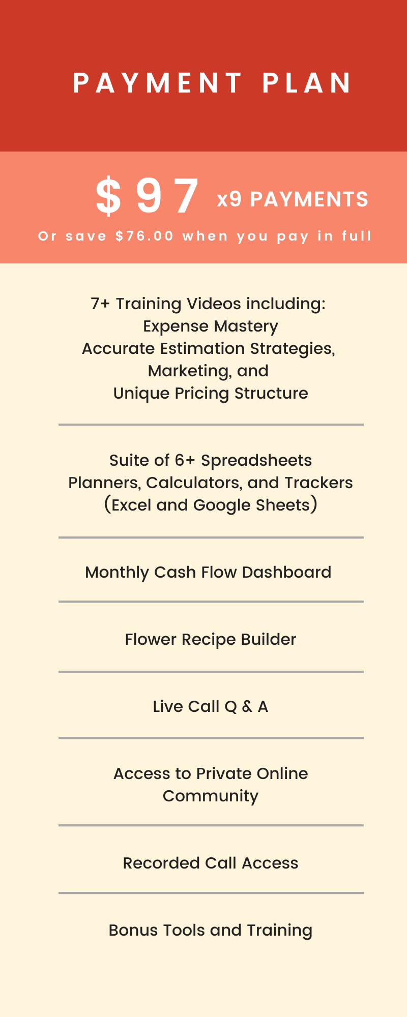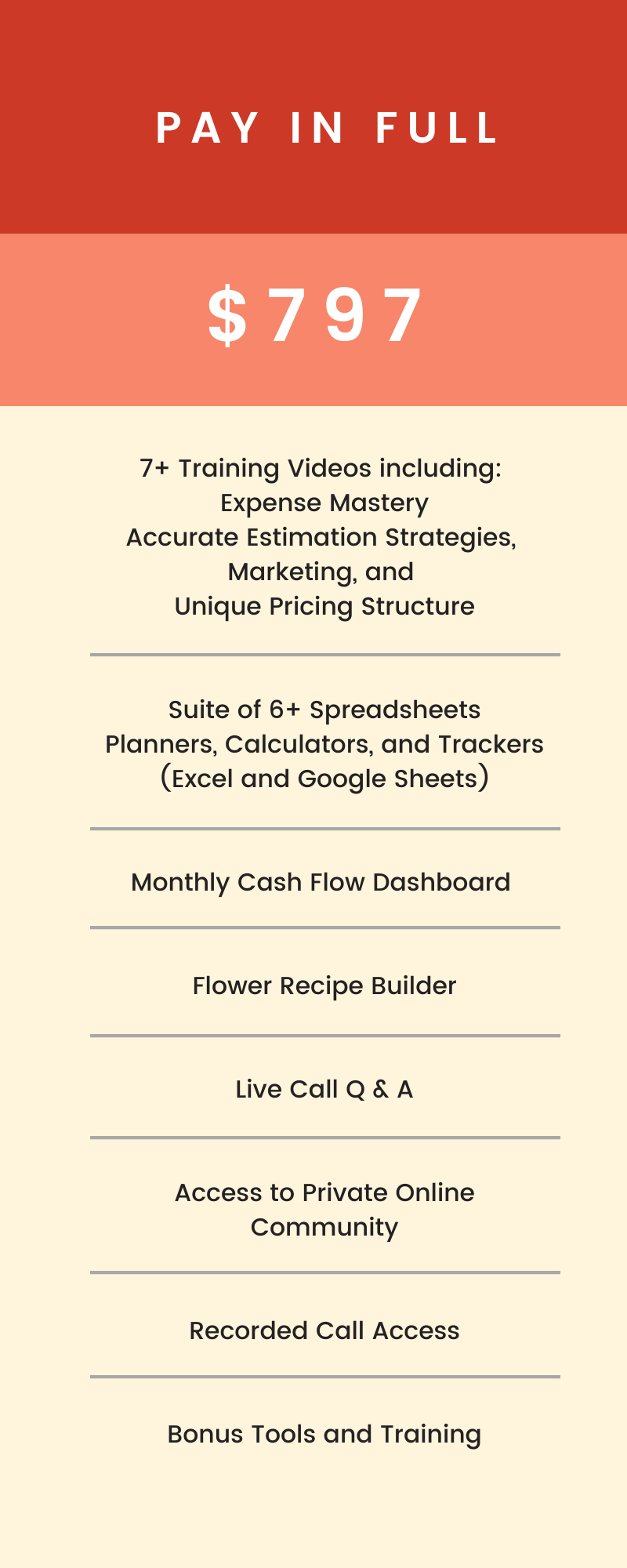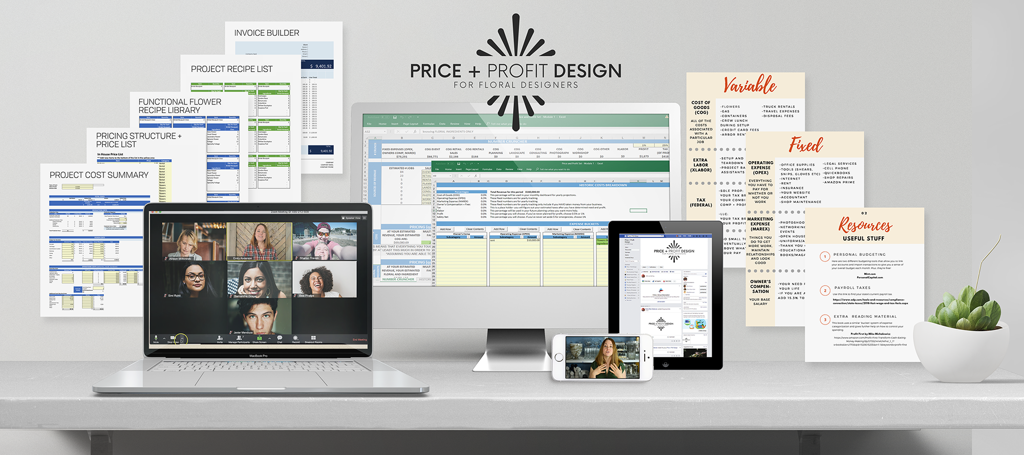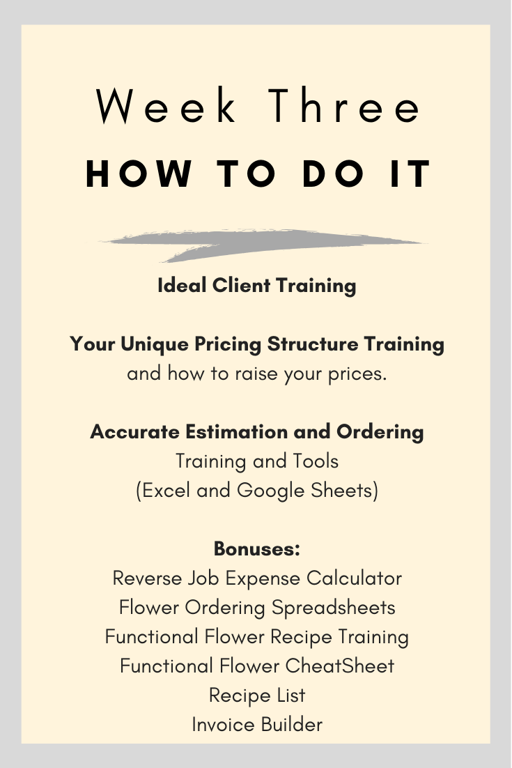 A: Yes. This course includes resources and spreadsheets that show you how WE order flowers, document recipes, and keep our flower quantities in line. It is not a standard way of doing it- just how it works in OUR company. This is included not as the main content but in the bonus section.